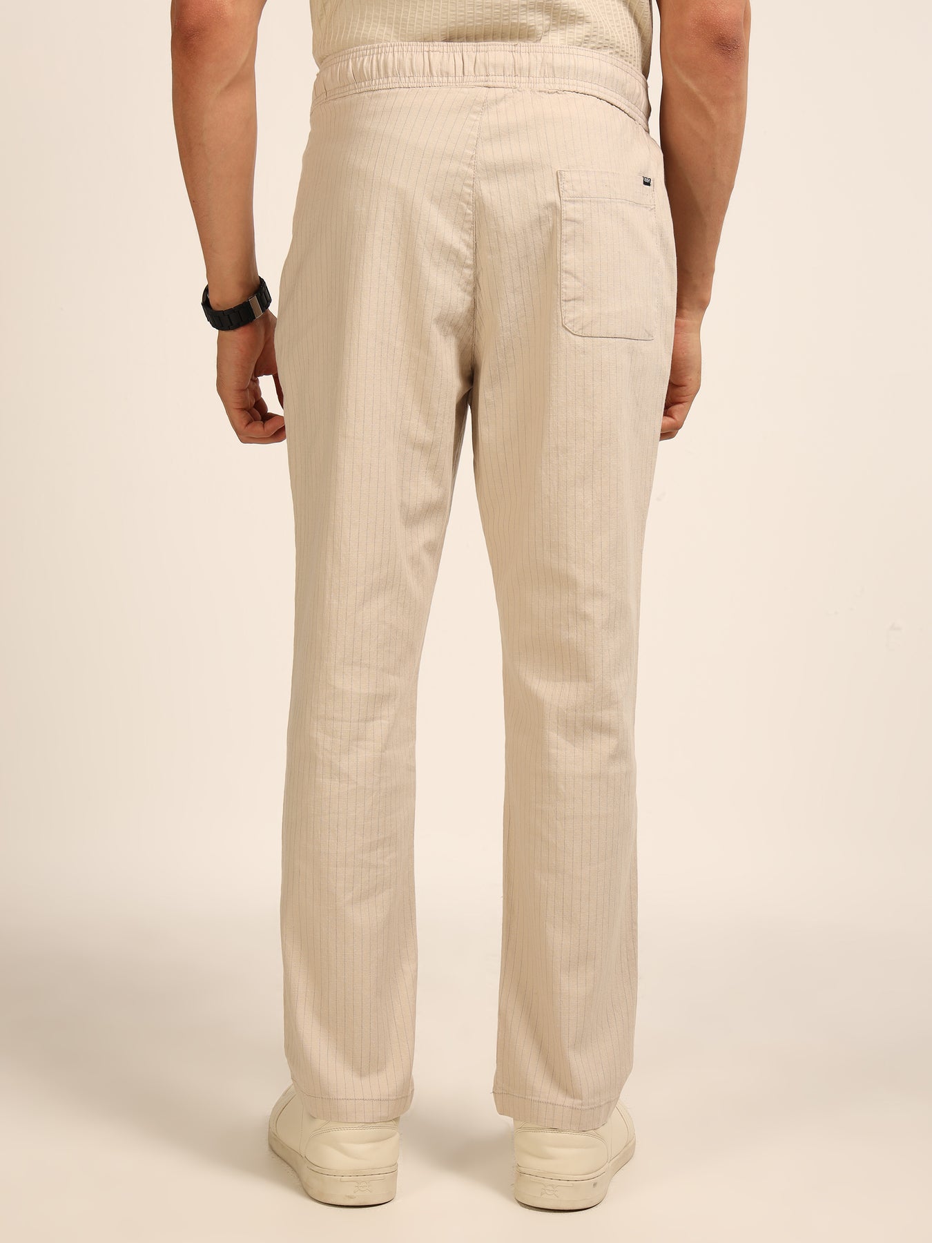 These beige striped Cotton-Linen pants offer a cool, breathable feel perfect for all-day comfort. Designed with a straight fit and an elastic drawstring waist, they deliver easy wear and a refined casual look. Ideal for daily outings, work-from-home, travel, or relaxed weekend style.