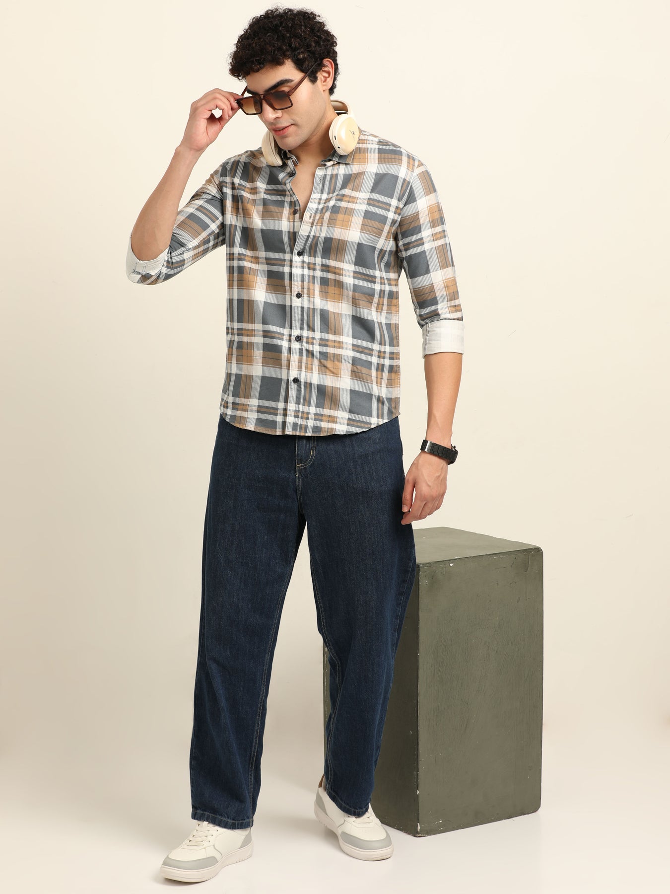 The muted grey and tan check pattern gives this shirt a modern, understated look that pairs effortlessly with jeans, chinos, or shorts. Designed with a regular fit, full button-down placket, and rolled-up sleeves option, it’s ideal for both casual Fridays and weekend outings.