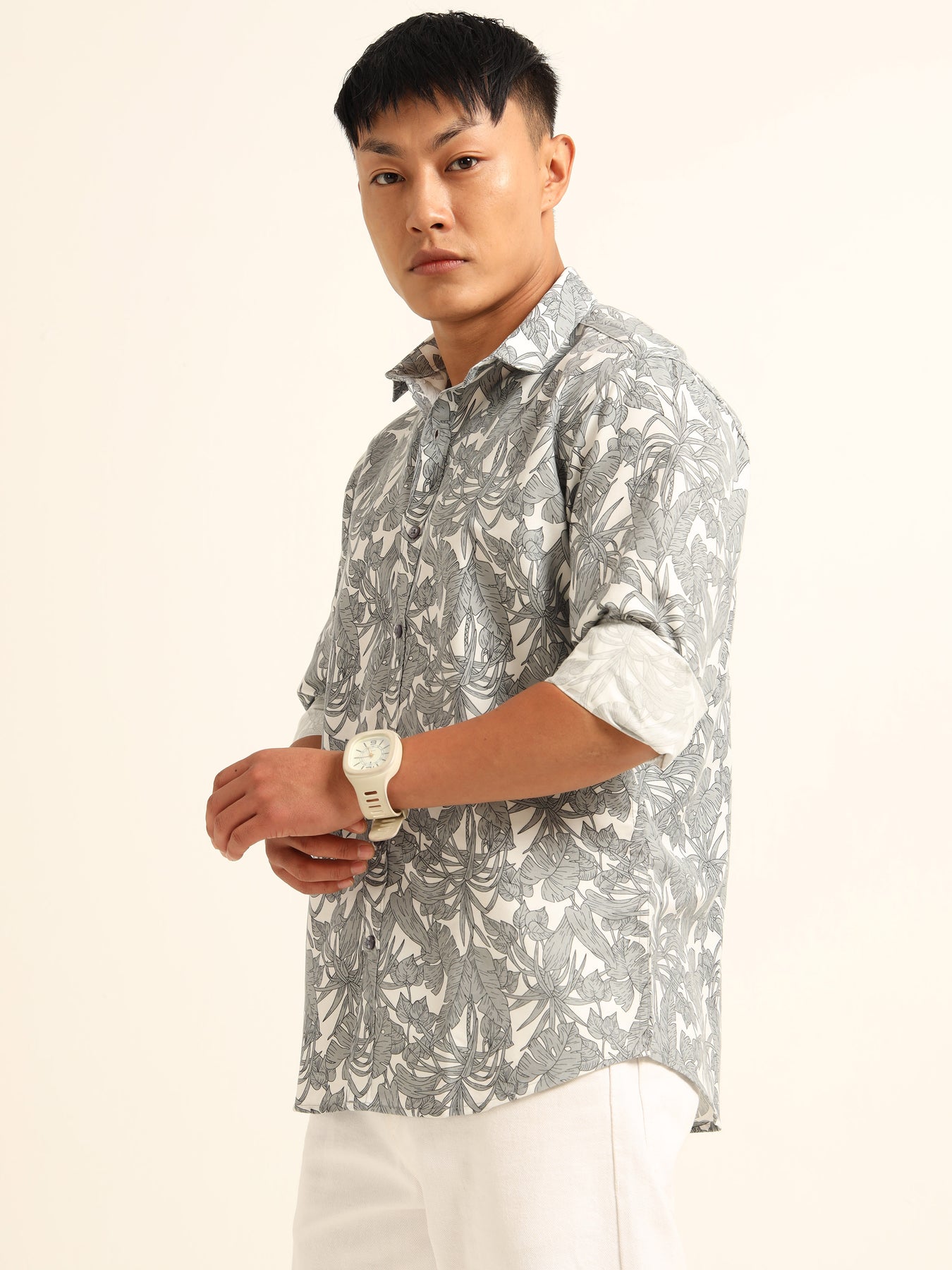 Elevate your casual look with this slim-fit shirt featuring a tropical leaf print. Made from soft, breathable fabric with a spread collar and long sleeves, perfect for relaxed yet stylish outings.