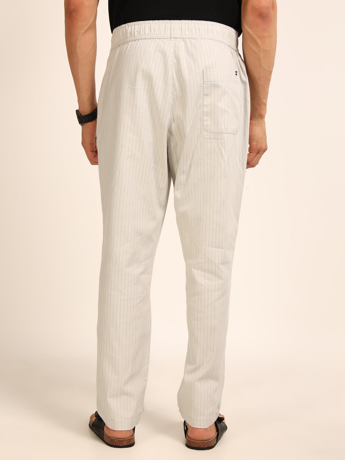 Crafted from a breathable Cotton-Linen , these straight-fit pants offer lightweight comfort for everyday wear. The elasticated drawstring waist provides a secure fit, while the subtle vertical stripes add a clean and stylish look. Perfect for casual outings, travel, and relaxed daily comfort.