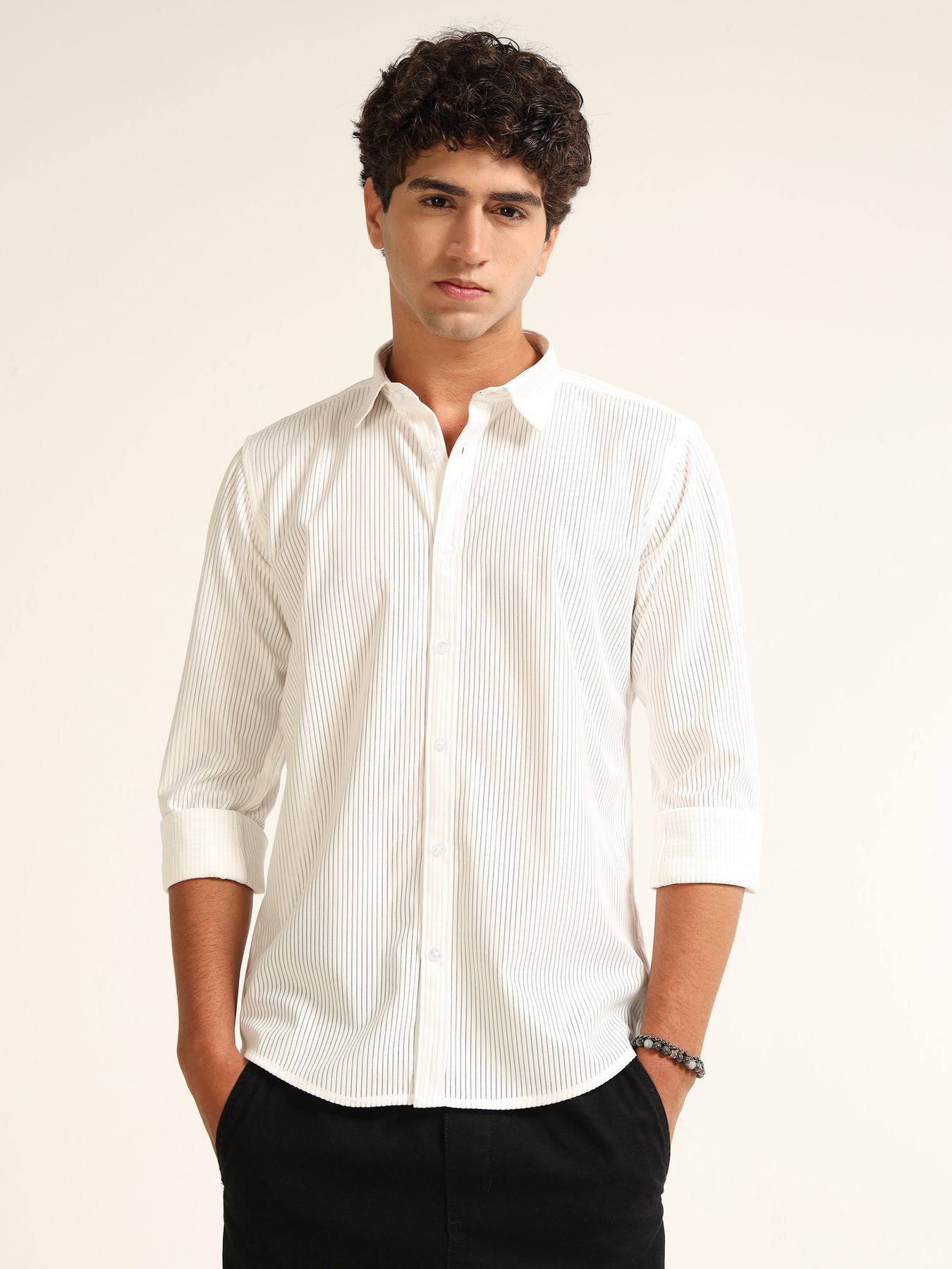 Elevate your everyday style with this Men’s White Slim Fit Striped Corduroy Shirt, a perfect blend of timeless elegance and modern tailoring. Designed for men who appreciate simplicity with sophistication, this shirt features subtle vertical pinstripes that add texture and class to your look without being overpowering.