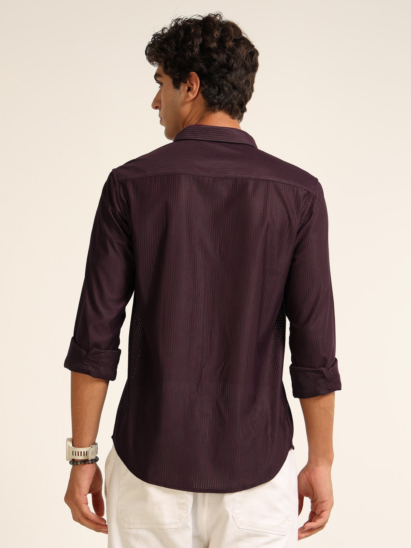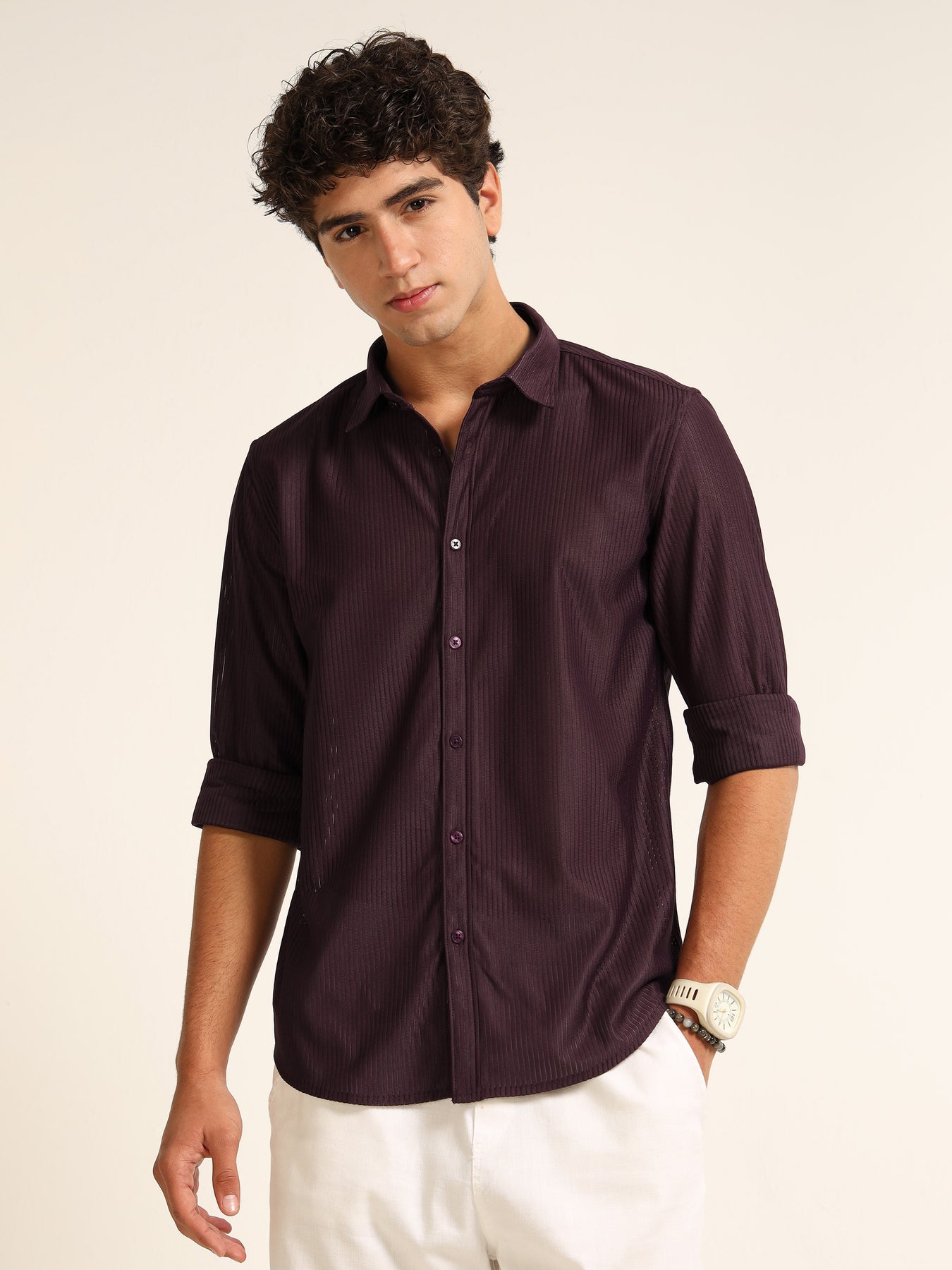 Add a touch of refined elegance to your wardrobe with this Men’s Slim Fit Wine Corduroy Shirt. Crafted from premium Polyester fabric, this shirt offers a perfect balance of comfort and sophistication. The deep maroon hue combined with subtle vertical texture detailing gives it a modern yet timeless appeal, making it a versatile choice for both day and night looks.